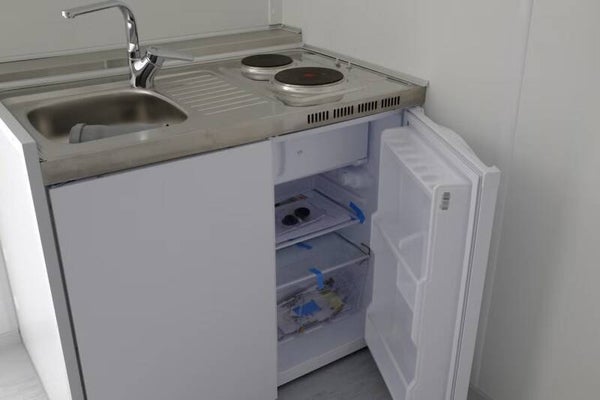 Cozinha equipada: lava-loiça, placa de cozinha, frigorífico e armários