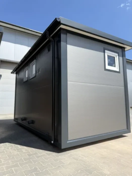 Acabamentos: calhas PVC, grelhas de ventilação, metal pintado 0,5 mm (RAL 7016)