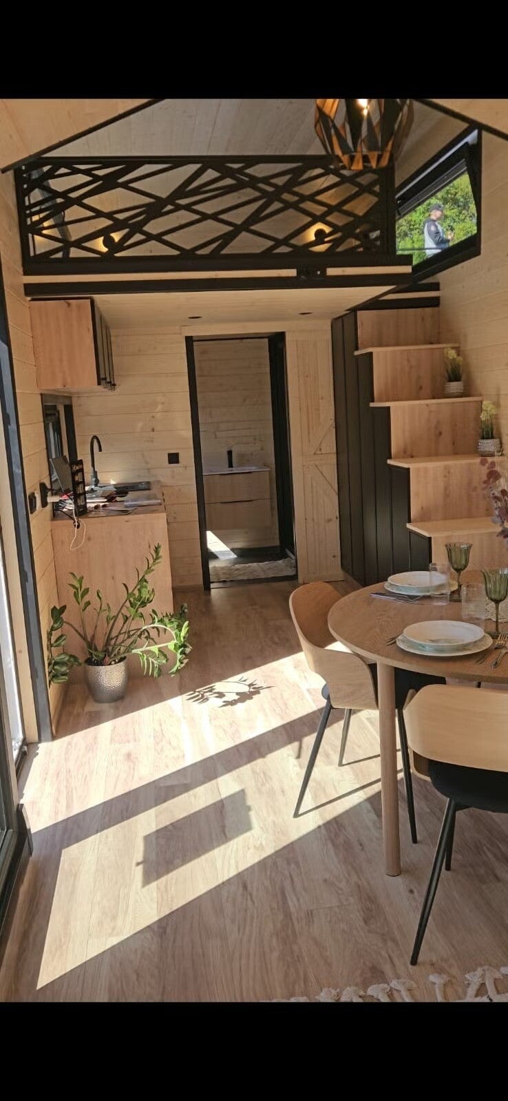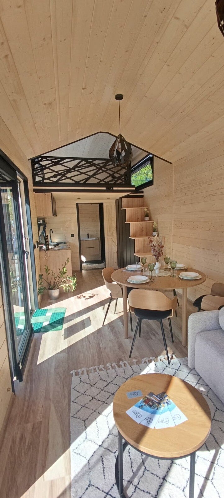 O Casa movel DANEY é uma T1 elegante e funcional, combinando madeira natural e detalhes pretos que criam um ambiente acolhedor e moderno.